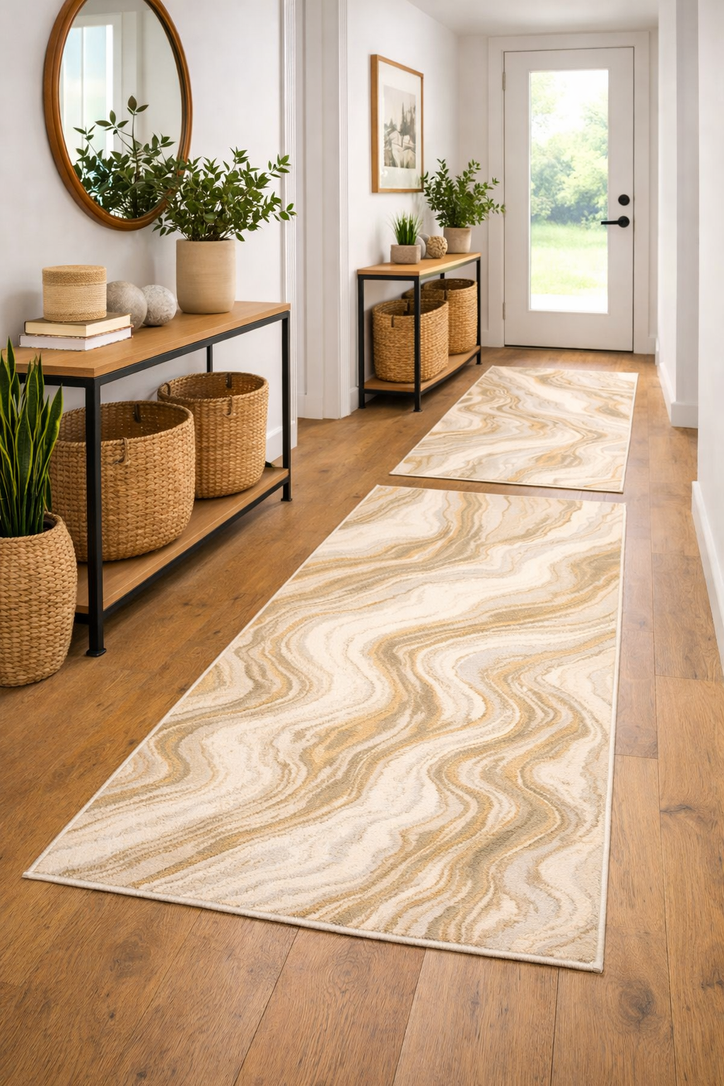 A Passadeira Ankara distingue-se pelo seu padrão de inspiração marmoreada, que cria um efeito visual sofisticado e contemporâneo. As variações subtis de tonalidade conferem profundidade ao desenho e tornam cada modelo visualmente interessante, integrando-se facilmente em ambientes modernos ou mais clássicos.