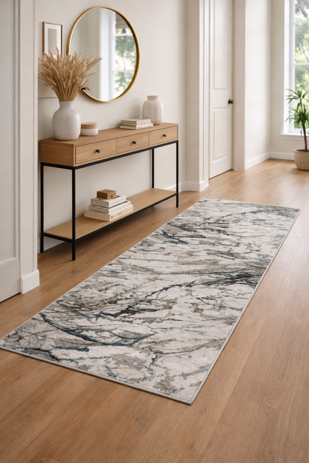A Passadeira Jaspe distingue-se pelo seu acabamento alcatifado e pela densidade superior, conferindo uma sensação mais estruturada e confortável sob os pés. Os efeitos marmoreados e os subtis apontamentos de cor criam um visual moderno e elegante, com ligeiro brilho que valoriza a base em tons neutros. Trata-se de uma peça pensada essencialmente para ambientes interiores, onde acrescenta profundidade, conforto e um toque contemporâneo à decoração.